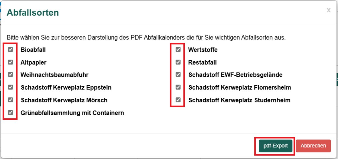Den Abfallkalender in Papierform können Sie als zusätzliches Angebot immer zu den Öffnungszeiten im Bürgerbüro des EWF, Ackerstraße 24 und im Bürgerservice im Rathaus, Rathausplatz 2–7 abholen!