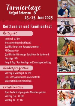 Vom 13. bis 15. Juni lädt der Reitclub Hofgut Petersau zu einem überregionalen Reitturnier ein, das gleichzeitig ein Familienfest ist. In dem historischen, denkmalgeschützten Hofgut erwarten Sie spannende Reitprüfungen für alle Altersklassen.