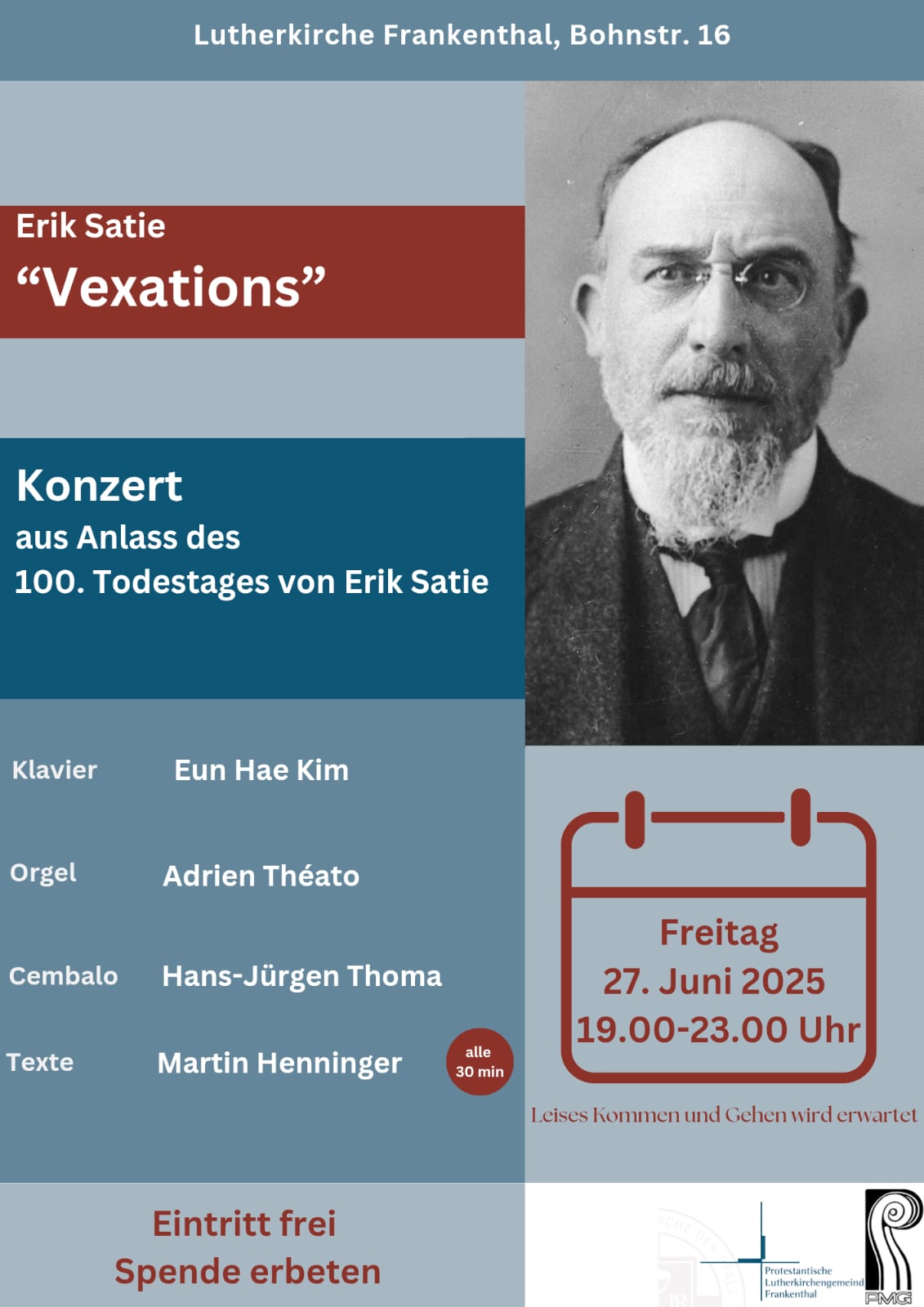 "Vexations" mit Eun Hae Kim, Klavier, Adrien Théato (Luxemburg) ,Orgel und Hans-Jürgen Thoma, Cembalo am Freitag, den 27. Juni 2025 von 19.00 bis 23.00 Uhr in der Lutherkirche Frankenthal.