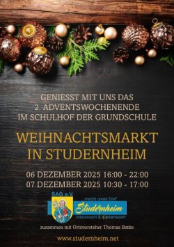 Die Studernheimer Arbeitsgemeinschaft e.V. lädt herzlich ein zum stimmungsvollen Weihnachtsmarkt im Schulhof der Grundschule.