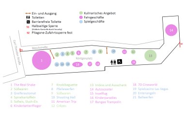 Sieben Tage lang laden die Schausteller zu Spiel, Spaß und Action ein: Mit Fahrgeschäften und Attraktionen für Groß und Klein, vom Autoscooter bis zum Rundfahrgeschäft. Pfeilballonwerfen und weitere Spielgeschäfte, Imbissbetriebe, Süßwaren- und Eisstände komplettieren das Angebot.