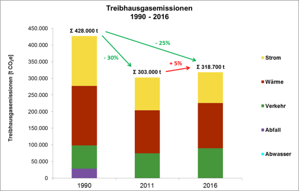 Damit belaufen sich die CO2-eq-Emissionen auf Grundlage des Gesamtenergieverbrauchs auf etwa 318.700 t/CO2 im Jahr 2016, was pro Einwohner Treibhausgasemissionen von etwa 6,57 t/CO2-eq pro Kopf entspricht.
