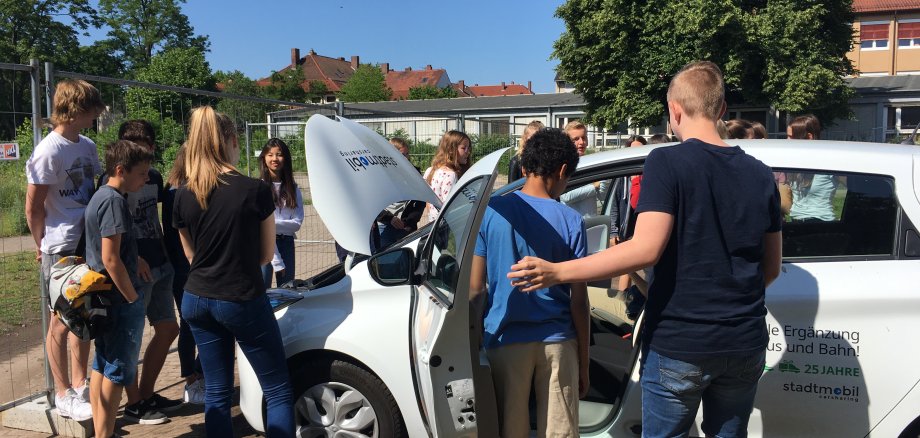 Die Pädagogin Christine Horn vom Verein Deutsche Umwelt-Aktion e.V. bringt den Schülerinnen und Schülern Frankenthaler Grund- und weiterführenden Schulen das Thema „Umweltfreundliche Mobilität“ näher. Im Gepäck hat sie ein Elektroauto und erklärt, wie E-Autos funktionieren, wie und wo sie geladen werden und wie verschiedene Verkehrsmittel sinnvoll miteinander kombiniert werden können.